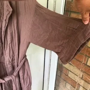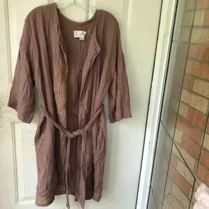 Stylish brown gauze cardigan with gold accents. Features a tie waist and open front. Perfect for layering.