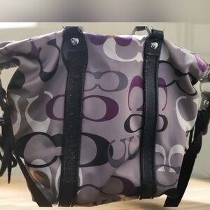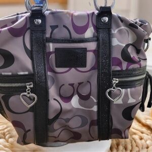 Coach 1941 Satin Sequin Poppy tote. Purple, black, and gray Op Art design. Dual coach heart zipper pulls.dark purple lining. Great condition.