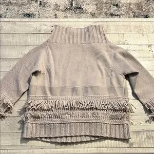Chic cowl neck sweater with button accents. Features fringe detailing for added style. Ideal for layering.