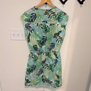 Vibrant tropical leaf print dress in shades of green and blue. Perfect for a casual outing. Great quality piece, 100% linen. Pretty trim details.