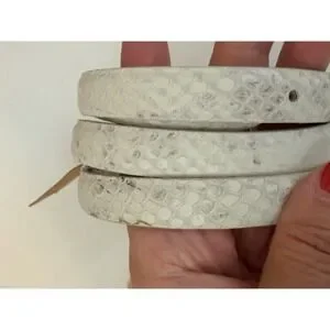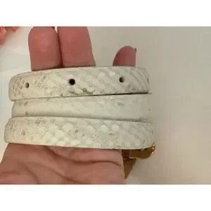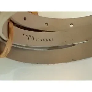 Rare and Unique Brazilian Designer Anna Pellissari Beautiful Gold Tone Buckle and Animal Print Leather Statement Skinny Belt "Manu" Style. 100% Authentic. Size Large. Fits : 31" to 37" Waist. Belt is 1/2 wide. Gold Tone Metal and Beige/ Gray Leather. Belt Features Gold Tone Distressed Buckle and Rustic Hand Dyed and tanned rustic leather. Unique Statement Belt. Brand New with the original Loggia Boutique Tag. A bit about Anna Pellissari : The designer said the philosophy for her products is "organic and natural but still sophisticated," and features combinations of different textures using Brazilian gems, wood, leather and metal as well as exotic skins such as ostrich and python. "All the dyes are derived from plants. There are no chemicals involved in the process of tanning the leather," she said.
