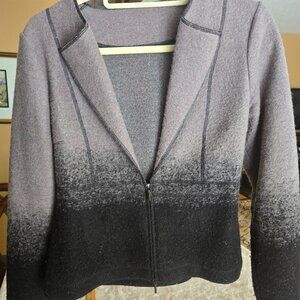 Suit in an original gradient color: a smooth transition from a soft, warm-toned light shade into deep black. The gradient appears on both the blazer and the skirt, giving the set a unique and elegant look.