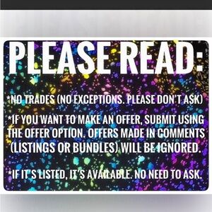 NO TRADES. If item is listed, it is available. Please submit offers using the offer button. Offers in comments will be ignored. Making comments on the price will result in member being blocked.