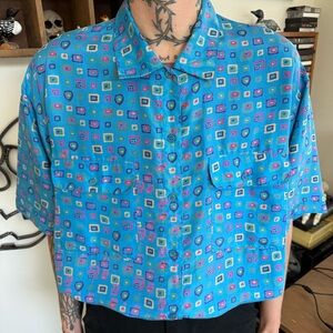 Vintage 80s 90s Blue Silk Multicolor Geometric Abstract S/S Button Down ~ Size L