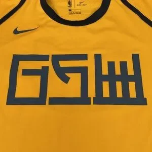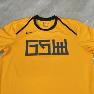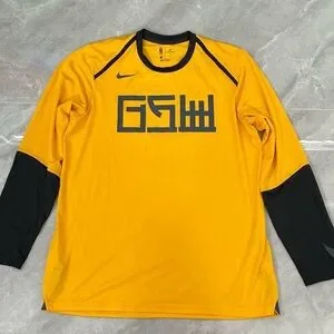Good condition - men’s Nike Dri Fit NBA Golden State Warriors 2017 City Edition Shooting Shirt. Colors: yellow/gold, blue/ gray, and black. Size: L.