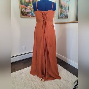 This elegant rust evening gown features a strapless design, perfect for formal occasions. The flowing silhouette adds a touch of sophistication.