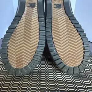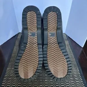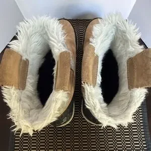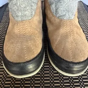 Warm boots with brown suede and gray fabric. Durable black sole. Soft fur lining. Sorel runs small. I’m a size 8 but these are too small for me.