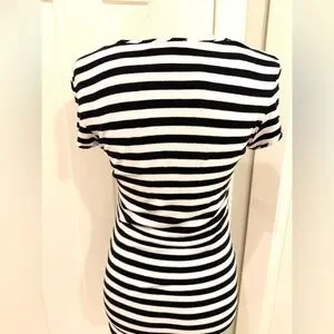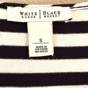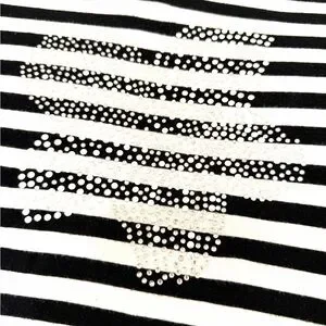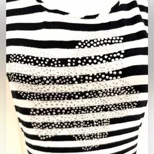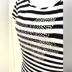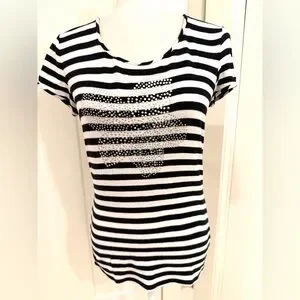 WHBM short sleeve, scoop neck top in black/white stripe with studded floral design on front in comfortable stretch fabric. Measurements - pit to pit 16 1/2 inches, length 26 inches. Measurements made lying flat and are approximate. Smoke free environment. Good pre owned condition.