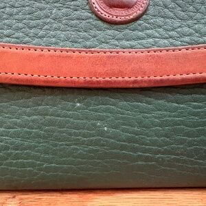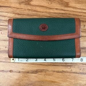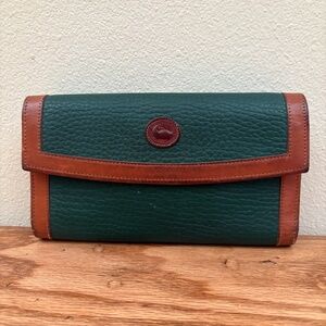 Preowned, vintage Dooney & Bourke organizer checkbook wallet, likely made in the late 90s or early 2000s. Made from Dooney's signature All Weather Leather in green, it's trimmed in smooth tan leather and has a small kiss lock coin purse on the back. The interior is partially lined in tan leather and features 6 card slots, an ID holder, a pen holder, a checkbook holder and two hidden slip pockets.