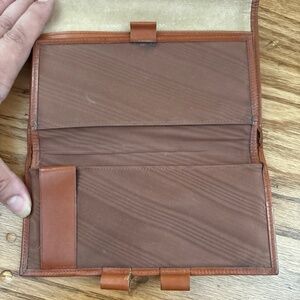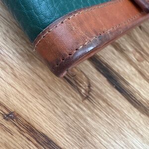 Preowned/vintage (20+ years old) with signs of age, use and prior wear: some marks/dings to the green AWL; patina, scratches and some darkening to smooth leather sections; the leatherette sections inside the coin purse and top flap of wallet are peeling and show some spots from use; some missing stitches to the corners where the wallet folds (see last three pics).