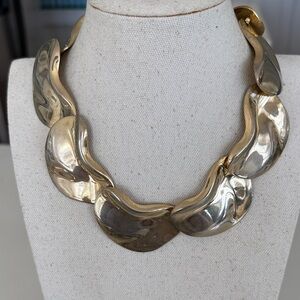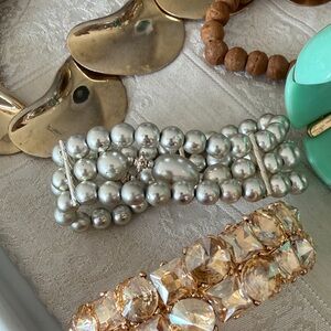 Elegant gold and silver jewelry set featuring bracelets and necklaces. Perfect for adding a touch of sophistication to any outfit.
