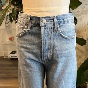 Stylish light blue jeans with classic stitching. Features a comfortable fit and durable fabric.