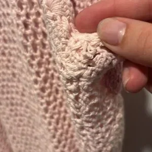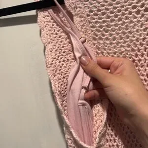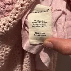 LoveShackFancy shelburne crochet maxi dress with detachable slip. There are a few places where the crochet material has been tied off, not snags or callouts. There is one spot where the threading is loose on the back collar, all pictured. No other callouts. Stock photo added for reference.