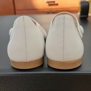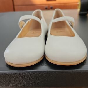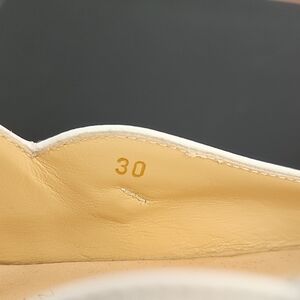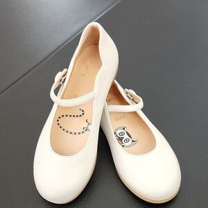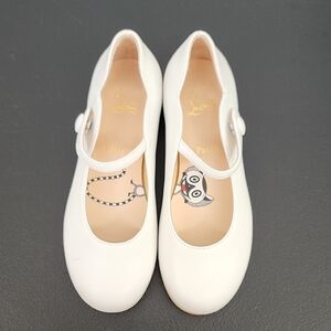 Christina Louboutin Melodie Chick children's dress shoe features white newbuck leather, a single elastic snap strap across the instep, a heart-shaped scalloped edge, an almond toe, and classic CL red sole. Mary Jane ballerina flat shoe in size 30, equivalent to US size 12. I do not have the box or dust covers for these shoes.