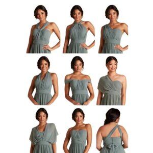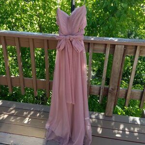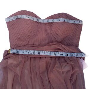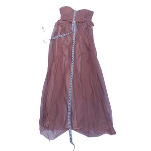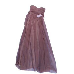 NEW WITH TAGS. Beautiful tulle fabric with stretch interior lining. 2 long attached streamers that can be maneuvered to make into various styles (see photo #9). Padded bra area. Color is "sandy mauve", light plum. Made of polyester. Measurements in photos. Measures: waist (all around) 30", armpit to armpit 17", front waist to bottom hem 47". Compare your measurements. From a smoke free and cat/dog friendly home. (BG7)