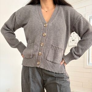 Fisherman style Boyfriend fit linen blend cardigan featuring overwized buttons & pockets. Color is dusty blue but leaning closer to a blueish-grey,