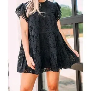 Chic black eyelet dress with short sleeves. Beautiful and flirty. Can be paired with boots, heels, wedges and sandals. Can be worn on any occasion. Styled western, boho or summer beach destination dress. With Detailed embroidery, great fabric and soft inner lining. Looks and feels expensive. Never worn.