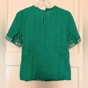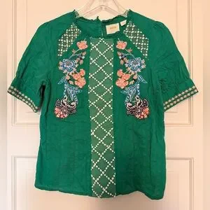 Chic green blouse with vibrant peach & blue floral embroidered cotton short-sleeved by Maeve from Anthropologie.