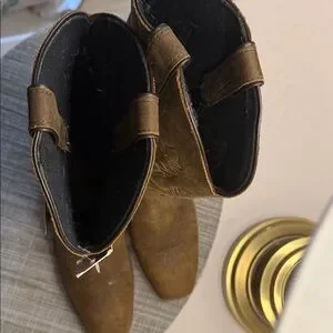 Stylish brown cowboy boots with intricate stitching. Perfect for a Western look.
