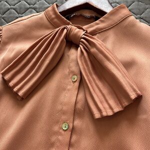 This elegant Zara blouse in a delicate pink shade showcases charming puff sleeves and a stylish mandarin collar. The tie front detail adds a touch of sophistication, making it a perfect choice for both casual and formal occasions.