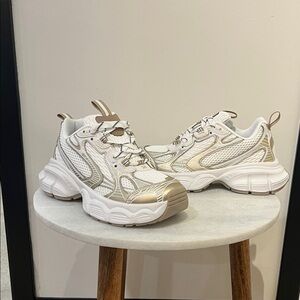 Step out in style with these elegant women's sneakers, featuring a chic white and gold design. Perfect for adding a touch of sophistication to any outfit.