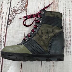 SOREL Lexie youth winter boots in excellent condition. Green and black lace-up boots with camo detailing and rugged rubber soles — stylish, warm, and perfect for winter weather.