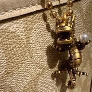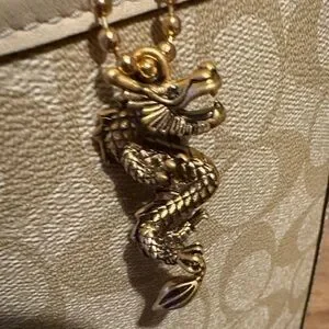 Gold tone dragon charm and leather hangtag