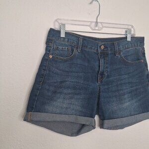 Pre-owned, good condition. No visible holes or stains. Normal signs of wash and wear. Distressed medium wash denim fabric. 5-pocket styling. 4.5 inch inseam. Size per tag: 10 Regular. Fabric: 97% Cotton/ 12% Polyester/ 1% Lycra/Spandex. Size per tag does not guarantee desired fit, please see pictures for measurements.