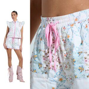 A sweet, spring‑ready pair of quilted shorts designed in a colorful patchwork of dainty floral prints. Crafted from a lightweight, swishy fabrication, these shorts feature a subtly puffy, quilted construction that gives them their signature charm. The high‑rise fit, elasticized waistband, and adjustable pink drawstring create a comfortable, customizable silhouette, while the pink contrast trim adds a polished, feminine finish. Fully lined in soft cotton for breathable comfort.