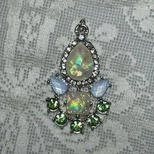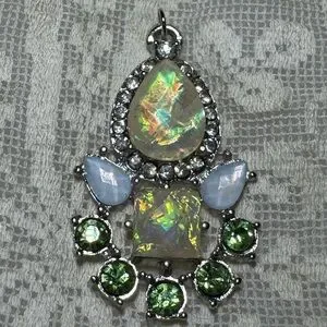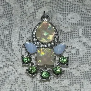 Elegant silver toned pendant featuring iridescent moonstone or opalescent rhinestones and green accent rhinestones. Striking medium sized pendant design for any memorable occasion.