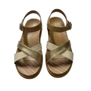 Step out in style with these chic tan and gold sandals. Perfect for any occasion, they offer both comfort and elegance.