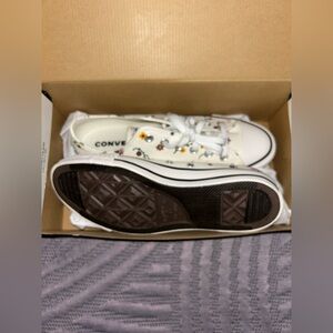 Converse sneakers featuring an embroidered floral design. White base with colorful flower accents. New in original box.