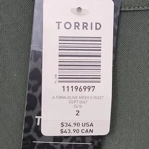 NWT new with tags women's Torrid Active Tank in Olive Green with a Mesh Inset, size 2X. Measurements are approximately 30.5" in length and 21.5" across the chest. Material content is 51% cotton/49% modal (contrast) 90% nylon/10% spandex (
