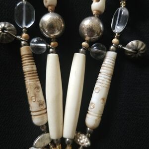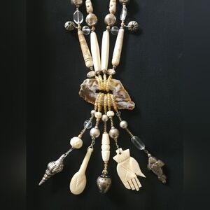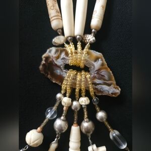 See photos for stunning details. This Amulet necklace features a blend of gold and cream beads, perfect for adding a touch of elegance to any outfit. The intricate design showcases a unique combination of textures and colors, making it a standout piece in your jewelry collection. 20.5" length. One of a kind!
