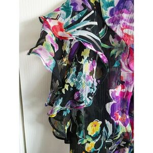 Radiate vibrant charm with this exquisite Lauren Ralph Lauren Petite blouse, a stunning piece designed to captivate. A cascade of bold floral blooms in hues of fuchsia, violet, and sunny yellow erupts against a deep black backdrop, creating a visually arresting display. Delicate ruffles flutter along the short sleeves and neckline, adding a touch of playful femininity.
