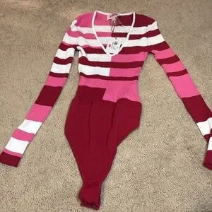 The Solid & Striped Michelle Bodysuit in a striped Crimson, Marshmallow & Bubblegum print is the perfect piece for cold weather. Featuring a v-neckline and flattering ribbed fabric, style this long sleeve bodysuit with denim or leather pants to go out to dinner, or shorts to wear during the day.