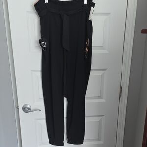Sophisticated black jogger style pants with a sleek tie detail. Perfect for any occasion.