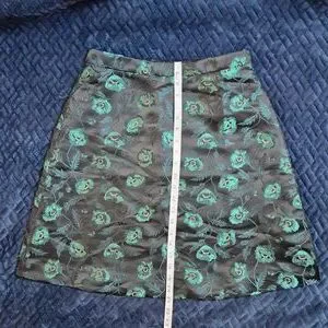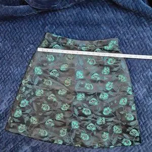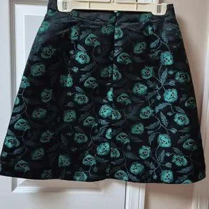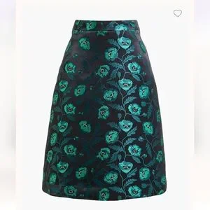 J. Crew Women's A line skirt featuring a striking green floral Poppy pattern throughout. Size 4. This skirt has a satin sheen to it. Zippered back with hook closure. Fully lined. Darting in the back. Approx measurements in photos.