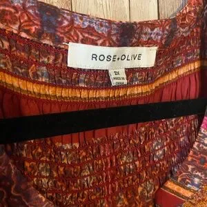 Rose + Olive women's 2X top, pre owned, no flaws found, see pictures, approximate measurements - 27 1/2 inches from pit to pit and 31 1/2 inches from top of shoulder to hem of top, non smoking, dog friendly home.