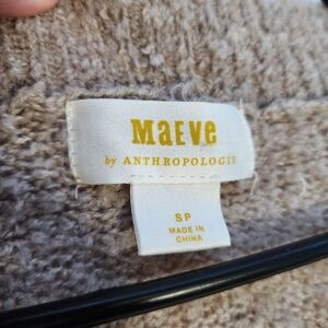 This Anthropologie sweater features a classic V-neck design in a warm tan color, offering a relaxed fit for ultimate comfort. Crafted from a soft, textured knit, it provides a versatile style that pairs effortlessly with various outfits. The full-length sleeves and subtle knit pattern add a touch of elegance to this timeless piece.