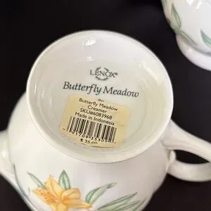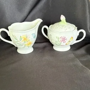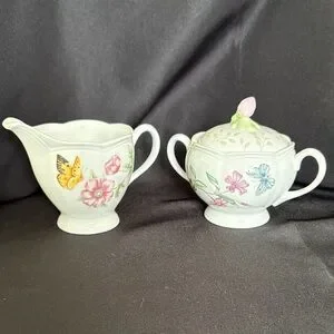 Elegant Lenox set with floral designs. Features a creamer and sugar bowl. Beautiful butterfly and flower motifs.
