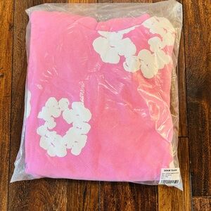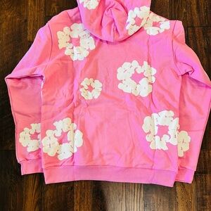 Stylish pink hoodie featuring a white floral pattern. Perfect for casual wear.
