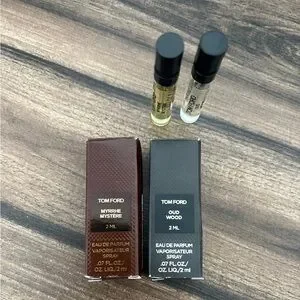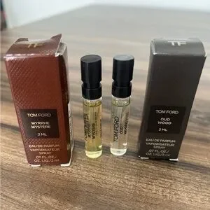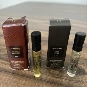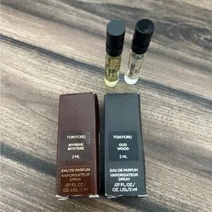 Tom Ford fragrance duo with Myrrhe Mystere and Oud Wood. Includes two 2ml bottles. Sophisticated scents.