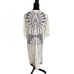 Romantic and boho-chic open-front lace kimono cardigan by Rebellion by Regine. Features intricate crochet floral embroidery, mid-length sleeves, and a lightweight mesh cotton-blend fabric. Perfect for layering over a dress, tank, or swimwear. Color is ivory/cream. Gently worn, in excellent condition.