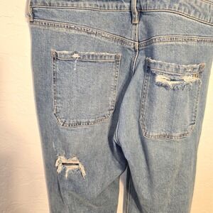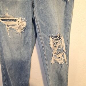 American Eagle 90s Boyfriend Overalls offer a relaxed, vintage-inspired fit with a medium wash denim. These overalls feature heavy distressing through the legs and back pocket for a lived-in look, complemented by unique pink elastic adjustable straps. The stretch denim blend ensures comfort while maintaining a classic workwear aesthetic.