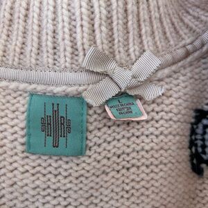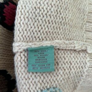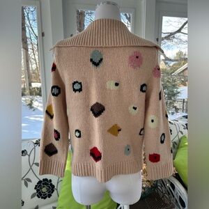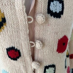 HWR brand from Anthropologie thick knitted cardigan sweater with multicolor "chocolate box" pattern. Sweater has ribbon front button band with knitted covered buttons and loop closure. Sailor collar.