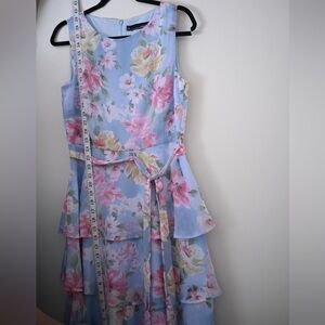 Keywords: Chetta B dress, women size 6 dress, blue floral midi dress, tiered midi dress, spring wedding guest dress, pastel floral dress, feminine romantic dress, garden party dress, baby shower dress, easter dress women, church dress, summer occasion dress, sleeveless midi dress, fairycore, whimsical, coquette, fit and flare dress, modest midi dress, tea length dress, vacation dress women, cottagecore dress, soft girl aesthetic, classic feminine style