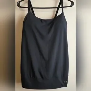 Under Armour black athletic tank featuring a flattering wrap-style open back, adjustable straps and built in bra.