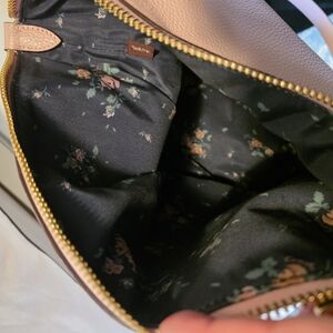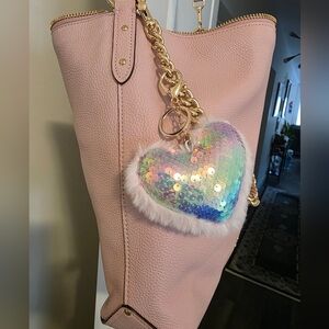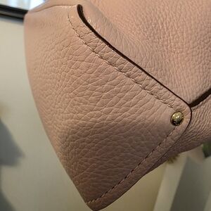 Elevate your style with this elegant pink leather shoulder bag from Coach. This bag is in very good condition. Clean inside and out. I think it may be the Val. Not 100 %. It is 11 in wide, 12 in high, depth is 4 in with lots of room inside. One inside snap pocket on the inside wall of the bag, one outside zip pocket on the back of the bag. Very pretty light pink with gold hardware. One adjustable strap with a max drop of 18 inches. Lovely gray floral lining. Very clean inside. Bag charms and gold chain are NOT included and are not for sale. They were used for inspiration only. Original hang tag included. Non smoking non pet home. I reuse shipping materials when available to me.