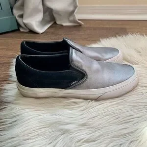 Step out in style with these sleek black and silver slip-on shoes. Perfect for any casual outing. Metallic leather with black suede.